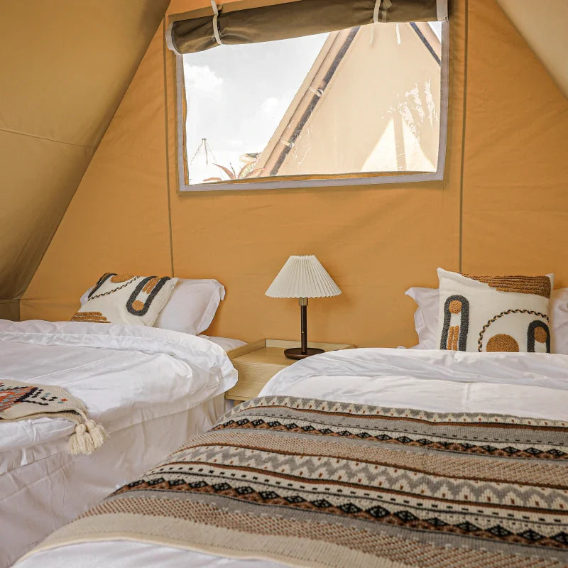 Though compact, this safari tent offers exceptional comfort for one to two guests. Designed to accommodate a queen or king-size bed (or two singles), it provides the essentials for a restful stay: lightweight flooring, breathable ventilation, mosquito netting, and a secure zippered entrance for privacy and peace of mind.