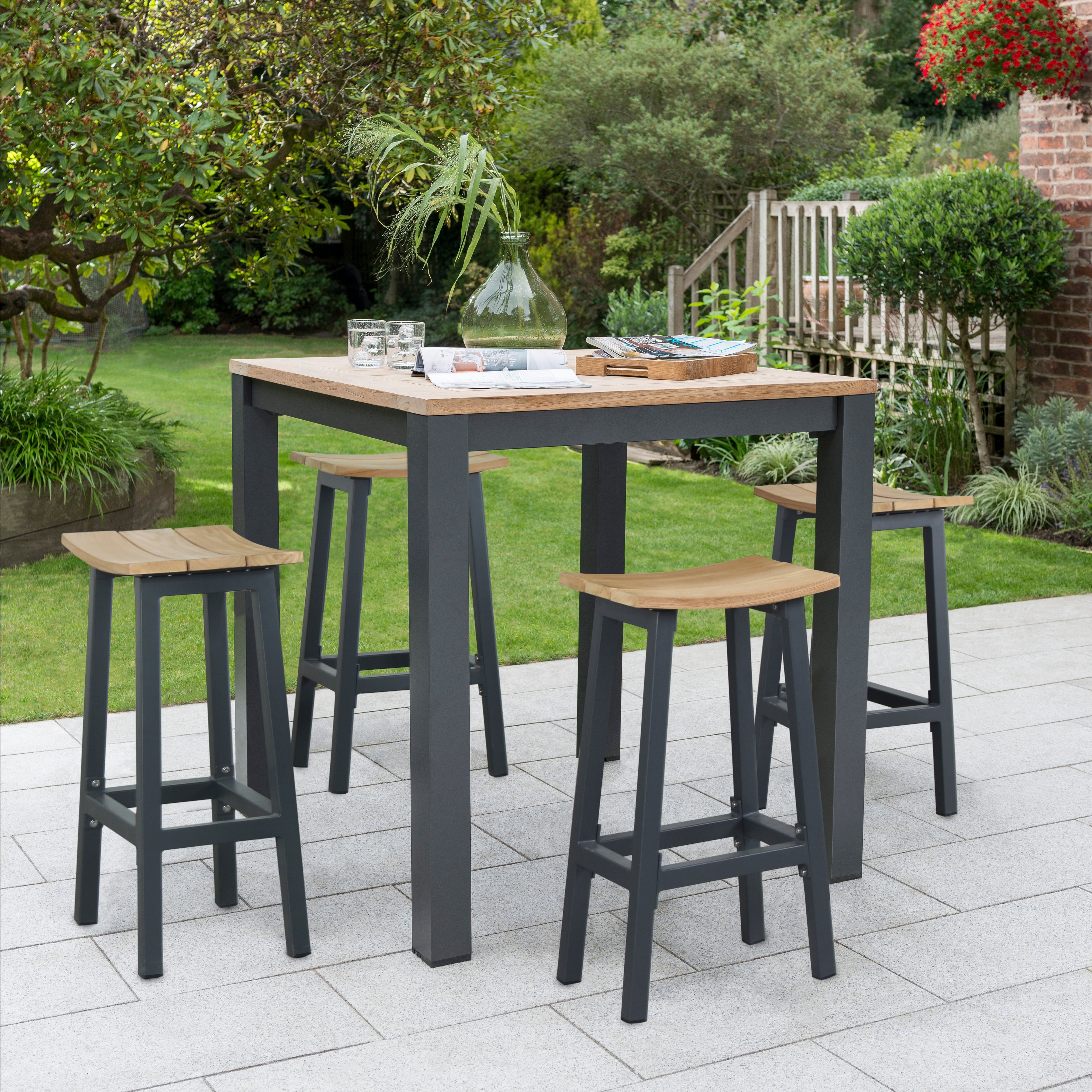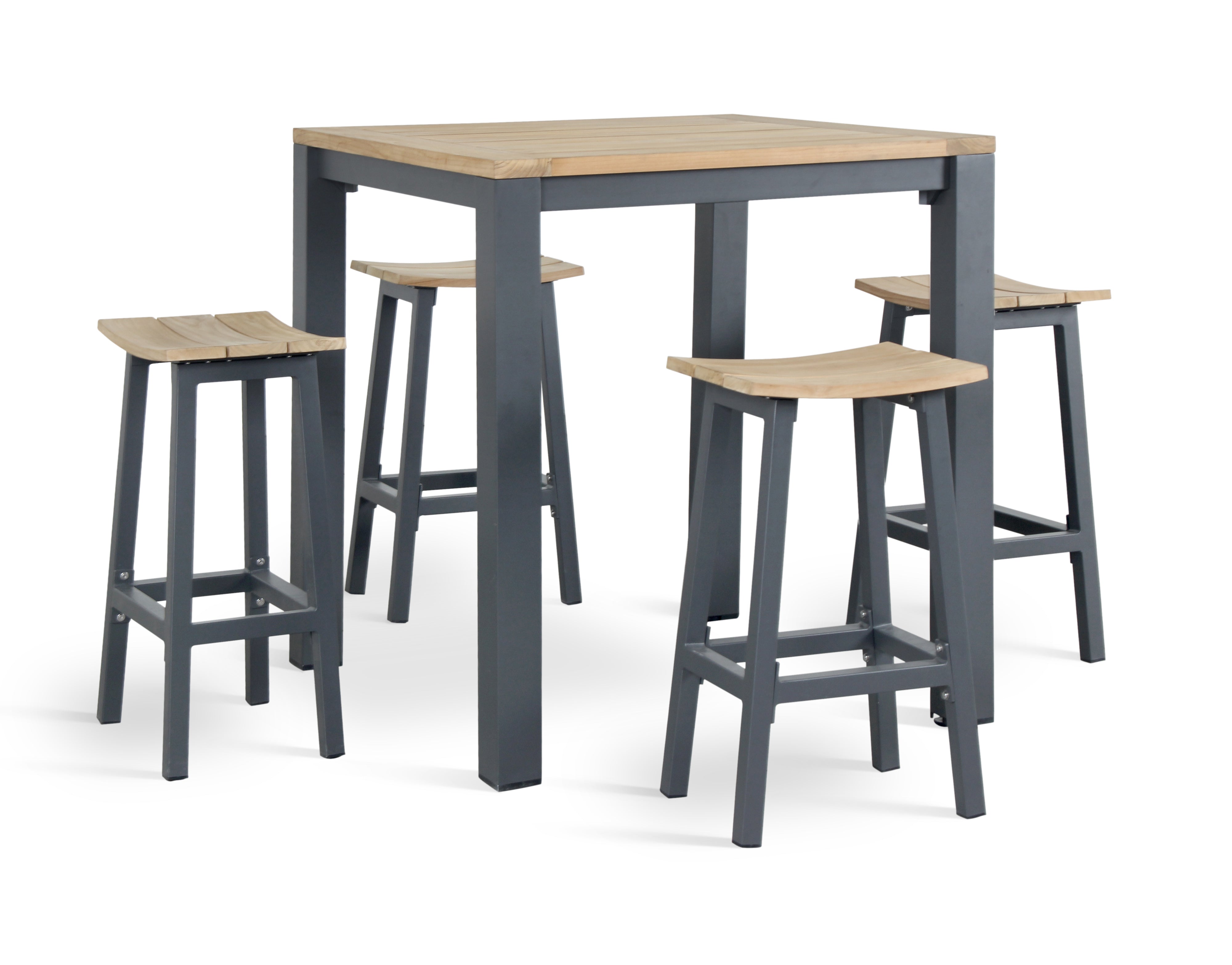 Built for the outdoors, the lightweight aluminium frame is FSC-certified, rustproof, and finished with a weather-resistant charcoal powder coat—designed to live outside through every season. Solid teak accents add depth and texture, ageing beautifully over time while retaining their strength. The contoured saddle seats offer an effortlessly comfortable perch, whether you're sharing drinks at sunset or gathering for brunch in the open air.