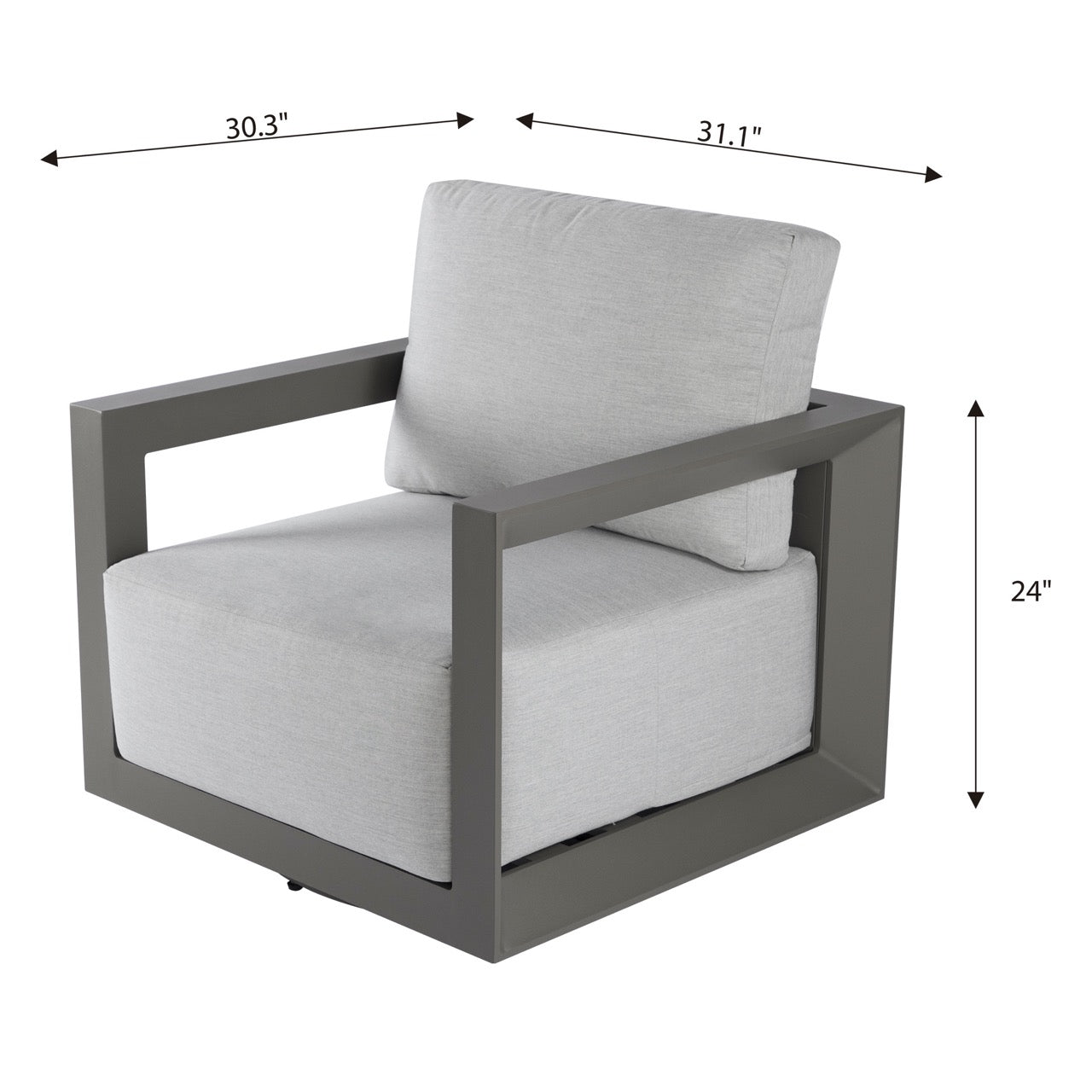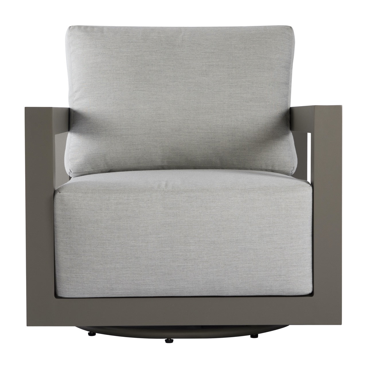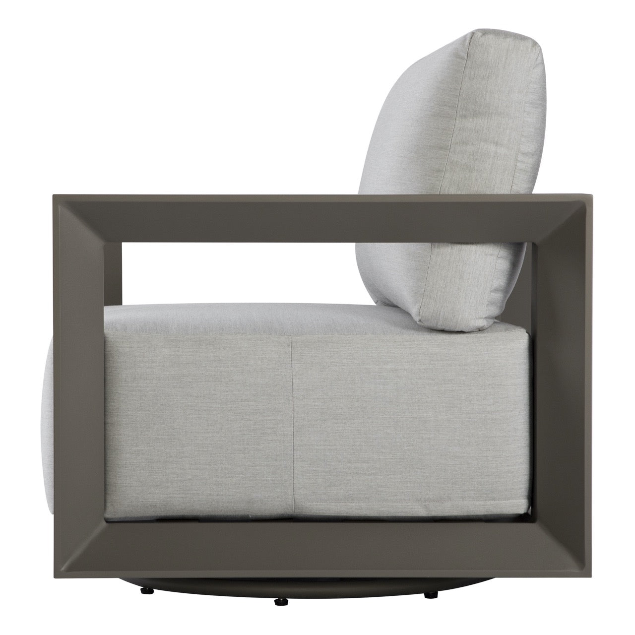 Deep cushions made with quick-drying foam deliver lasting comfort, while Sunbrella® Canvas Granite upholstery adds a sophisticated, easy-care touch that resists fading, moisture, and everyday wear. Crafted to meet commercial-grade standards, the Newport Swivel Chair is ideal for both luxury homes and high-traffic hospitality spaces. With its clean lines and contemporary silhouette, it creates a striking yet understated focal point for patios, poolside lounges, and modern outdoor retreats.
