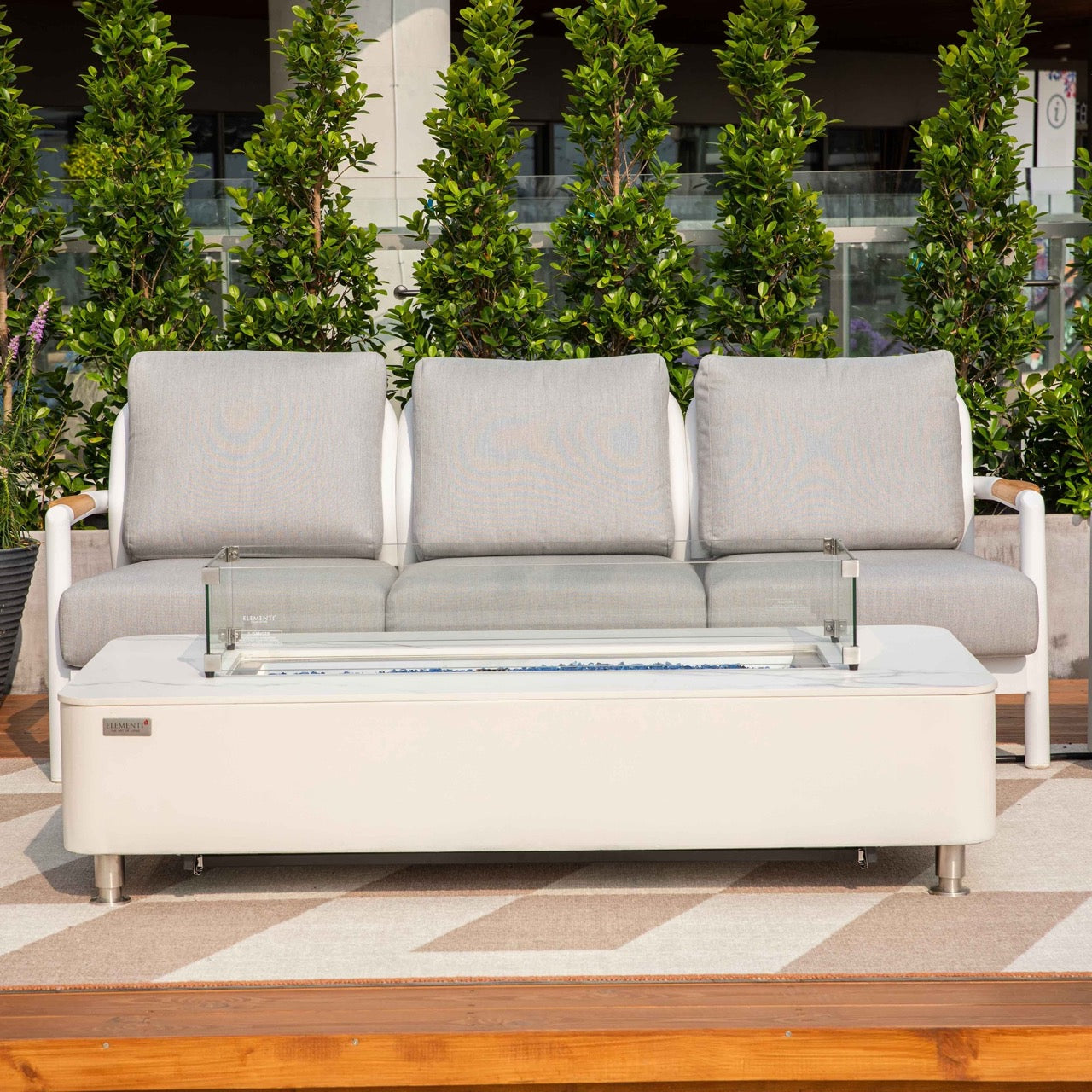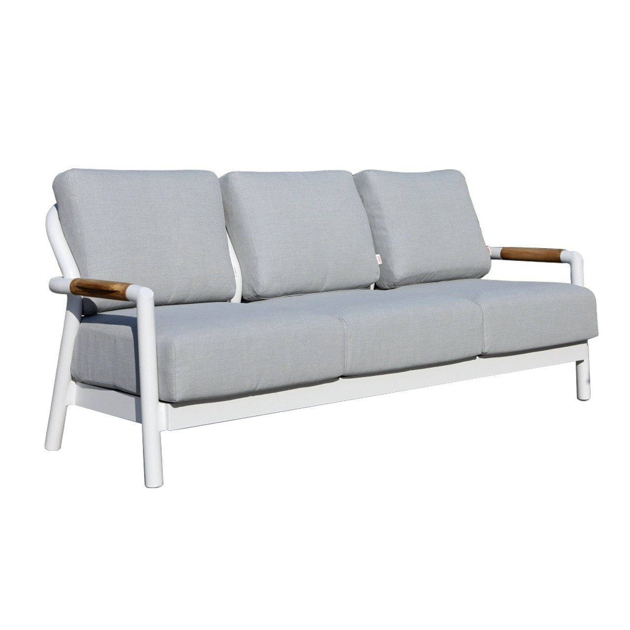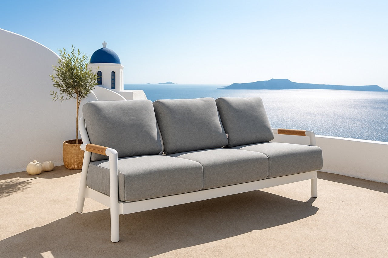 The Santorini 3-Seat Sofa brings effortless coastal elegance to your outdoor living space. Its crisp white, powder-coated aluminum frame is paired with warm teak accents, creating a refined balance of modern design and natural texture. Deep Grey Chine Sunbrella® cushions, filled with high-resiliency foam, offer exceptional comfort while standing up to sun, rain, and daily outdoor use.