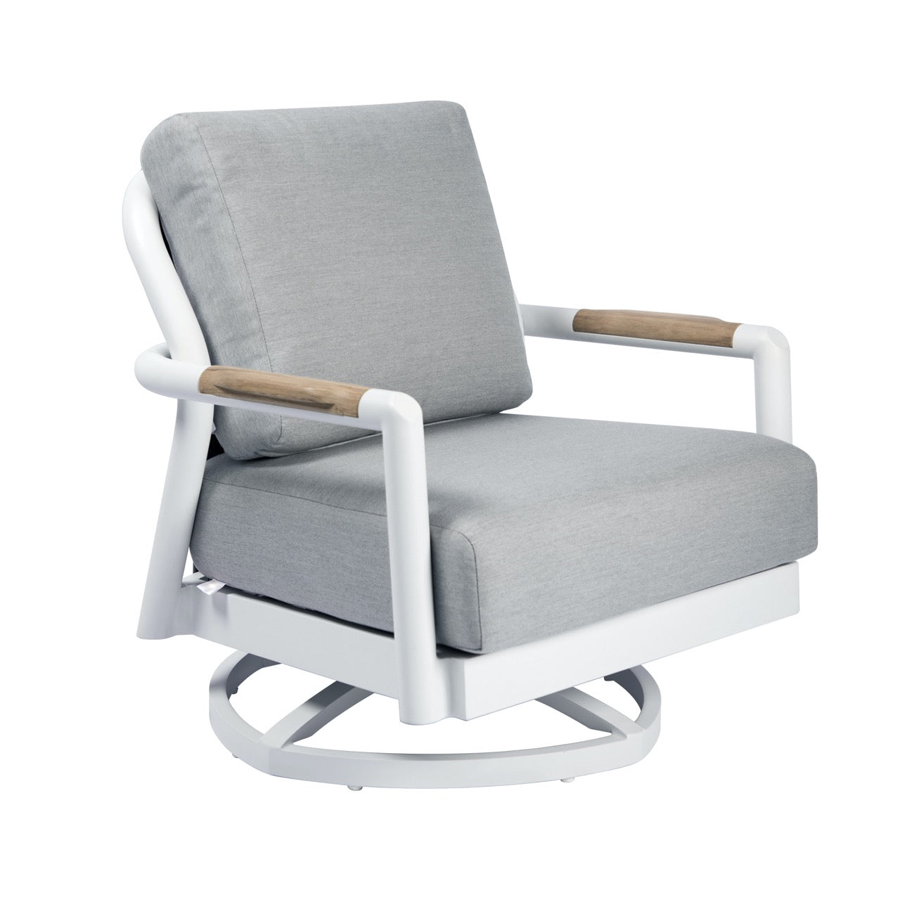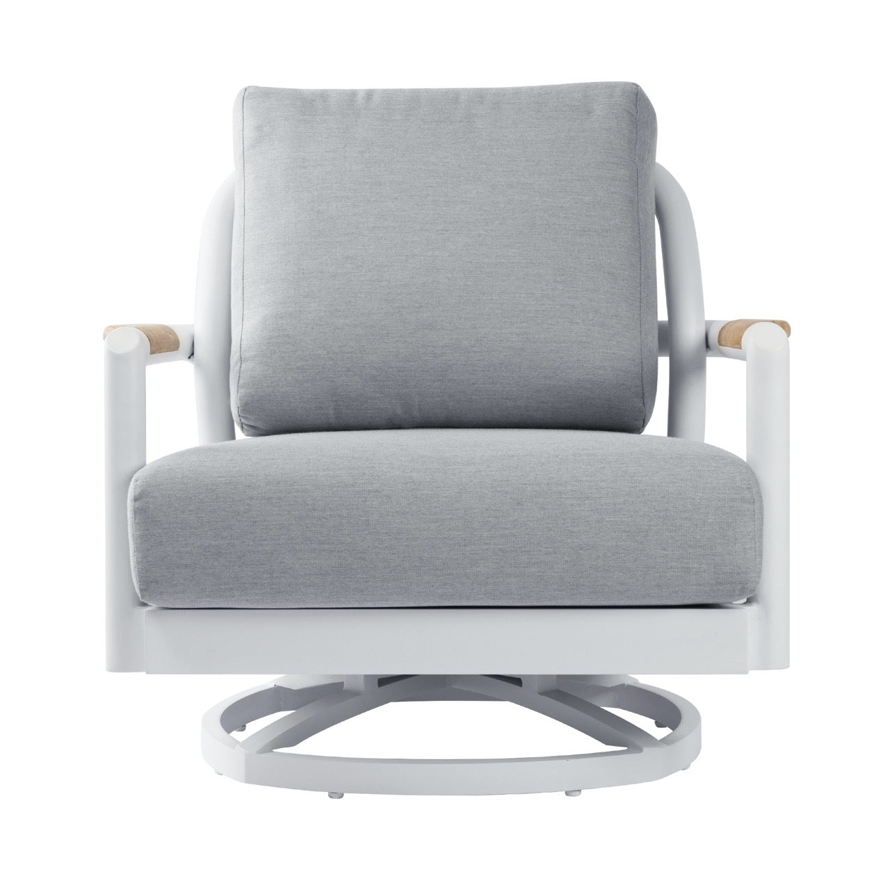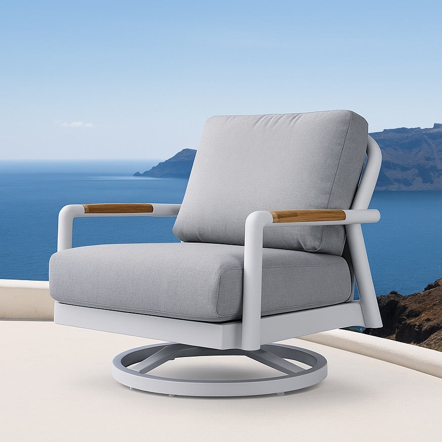 The Santorini Swivel Lounge Chair brings together effortless motion, elevated comfort, and modern coastal style—perfect for refined outdoor living. Its sturdy white powder-coated aluminum frame is complemented by warm teak accents, creating a timeless silhouette that feels both relaxed and luxurious. Soft yet durable Grey Chine Sunbrella® cushions, filled with high-resiliency foam, offer exceptional comfort while standing up to sun, rain, and everyday outdoor use.