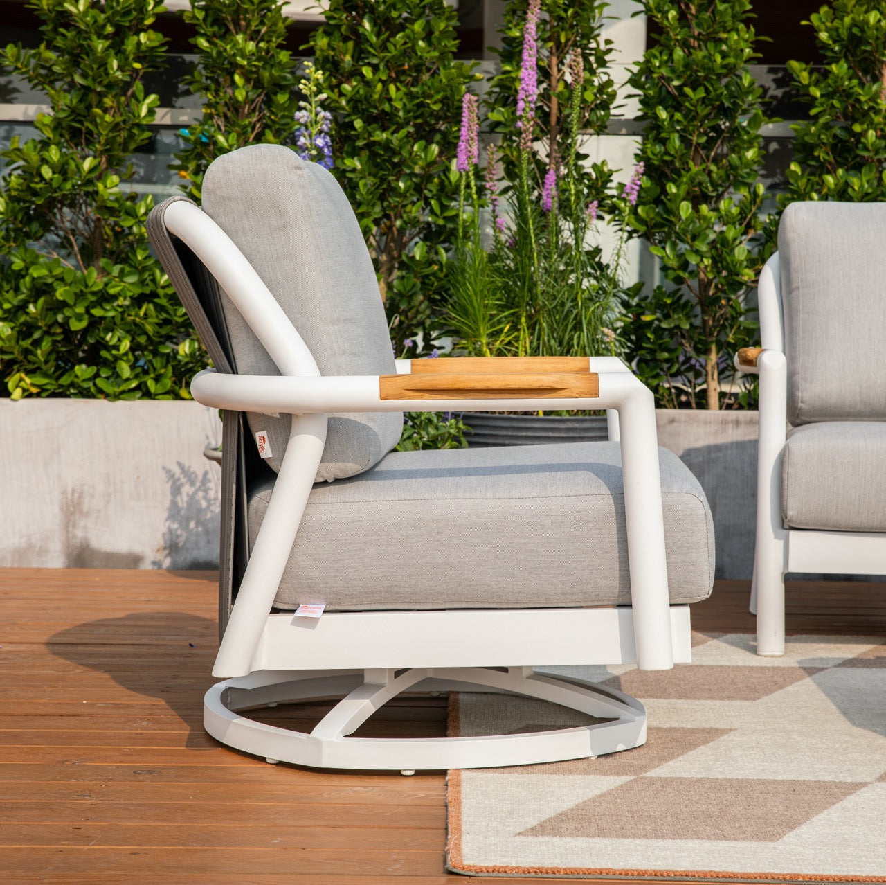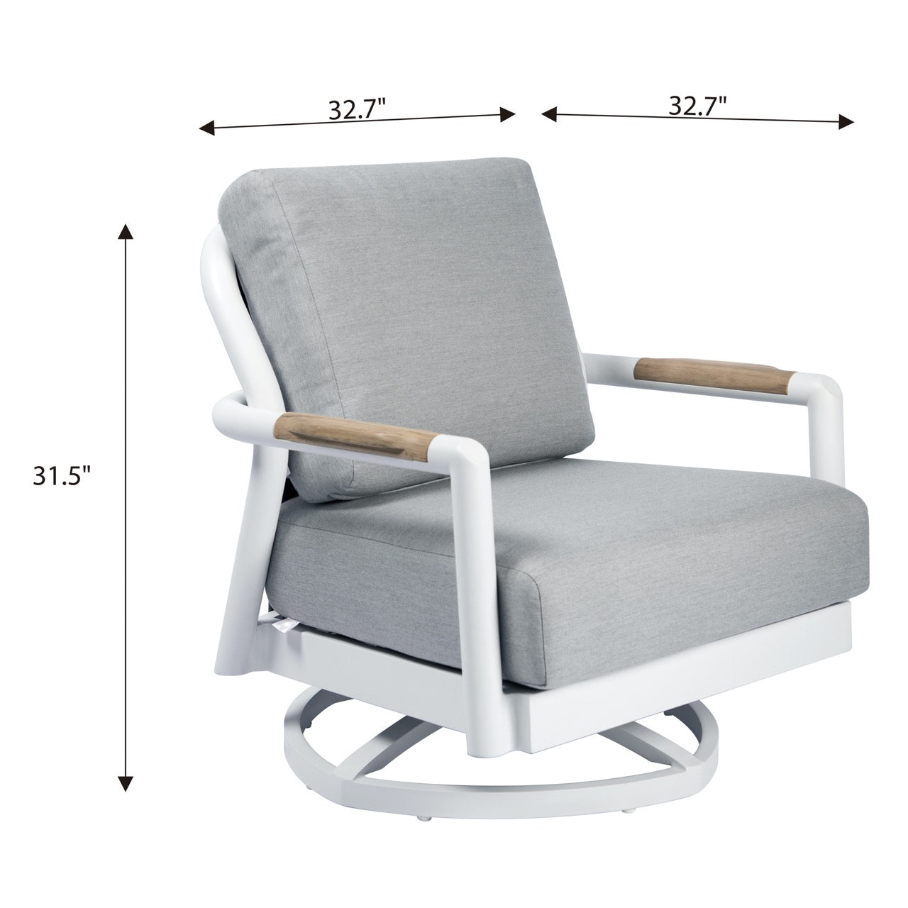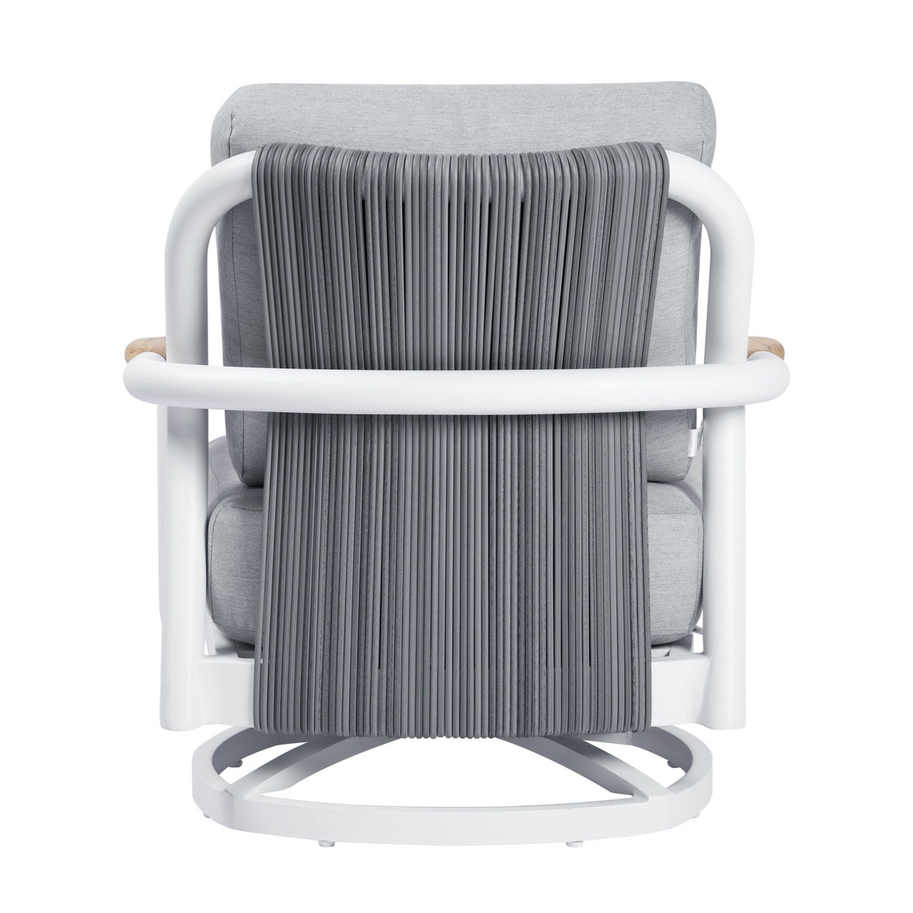 The Santorini Swivel Lounge Chair brings together effortless motion, elevated comfort, and modern coastal style—perfect for refined outdoor living. Its sturdy white powder-coated aluminum frame is complemented by warm teak accents, creating a timeless silhouette that feels both relaxed and luxurious. Soft yet durable Grey Chine Sunbrella® cushions, filled with high-resiliency foam, offer exceptional comfort while standing up to sun, rain, and everyday outdoor use.