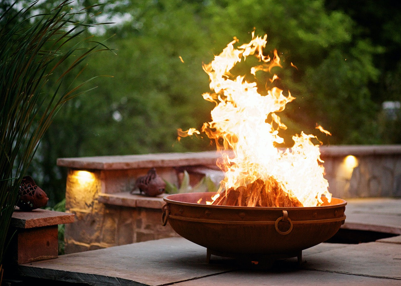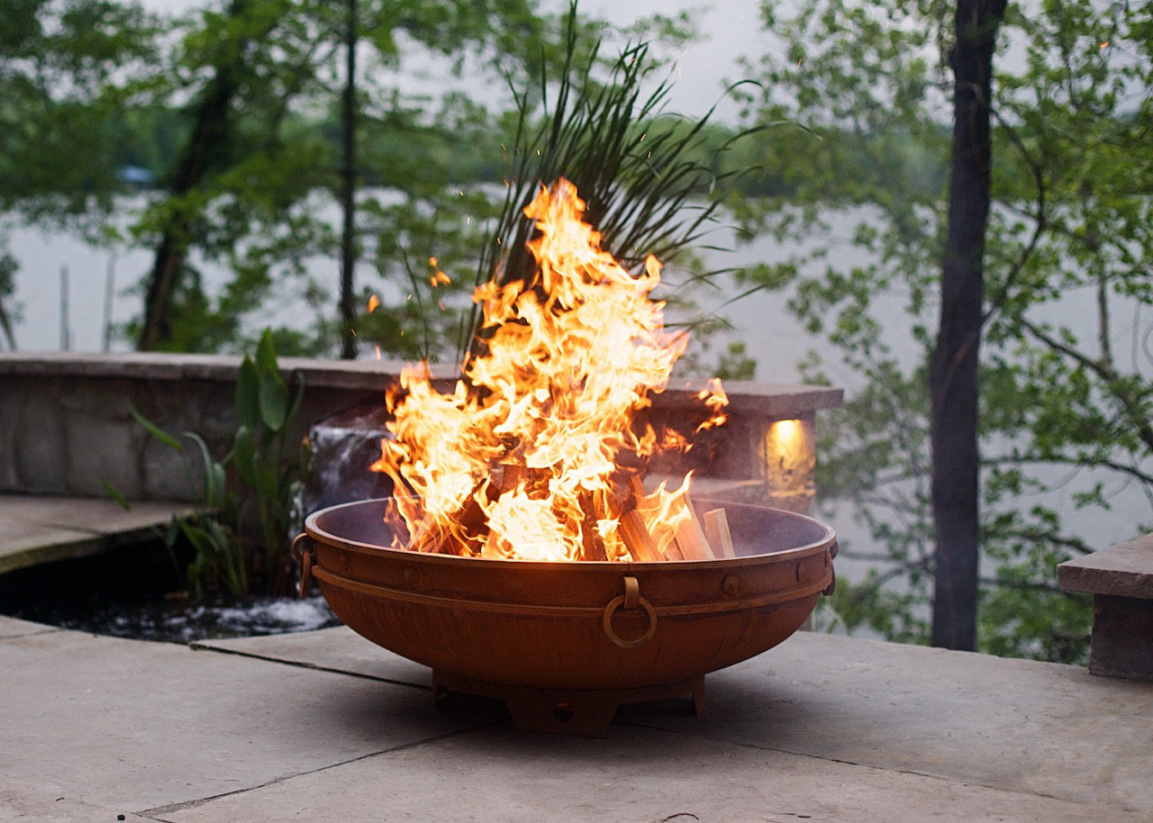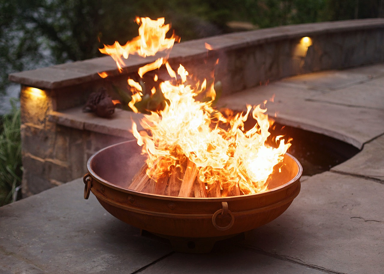 A fire feature carved from history — the Emperor Fire Pit blends ancient design elements with modern performance. Solid steel banding, bold rivet detailing, and classic lifting rings evoke the grandeur of old-world kingdoms, while its low-profile shape keeps the mesmerizing fire in full view — from roaring flames to softly glowing embers.