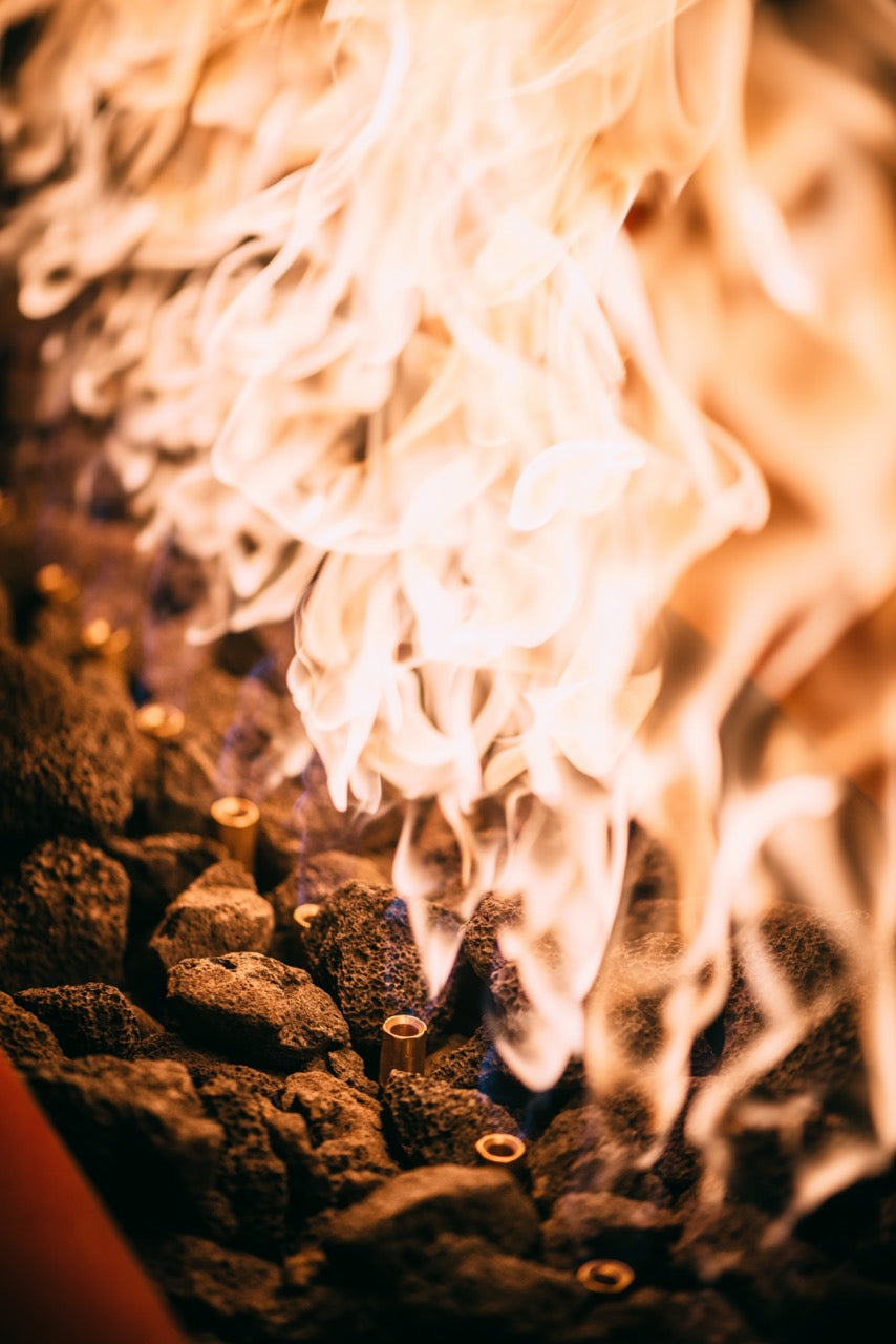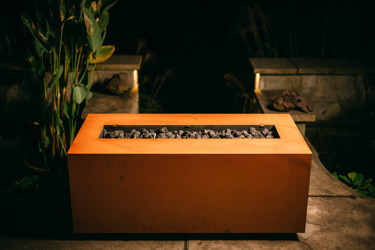 This modern fire pit is built to perform as beautifully as it looks, featuring a lifetime-warrantied stainless steel burner, solid brass keyed valve, stainless-steel gas flex lines, and natural lava rock for a dynamic flame display.