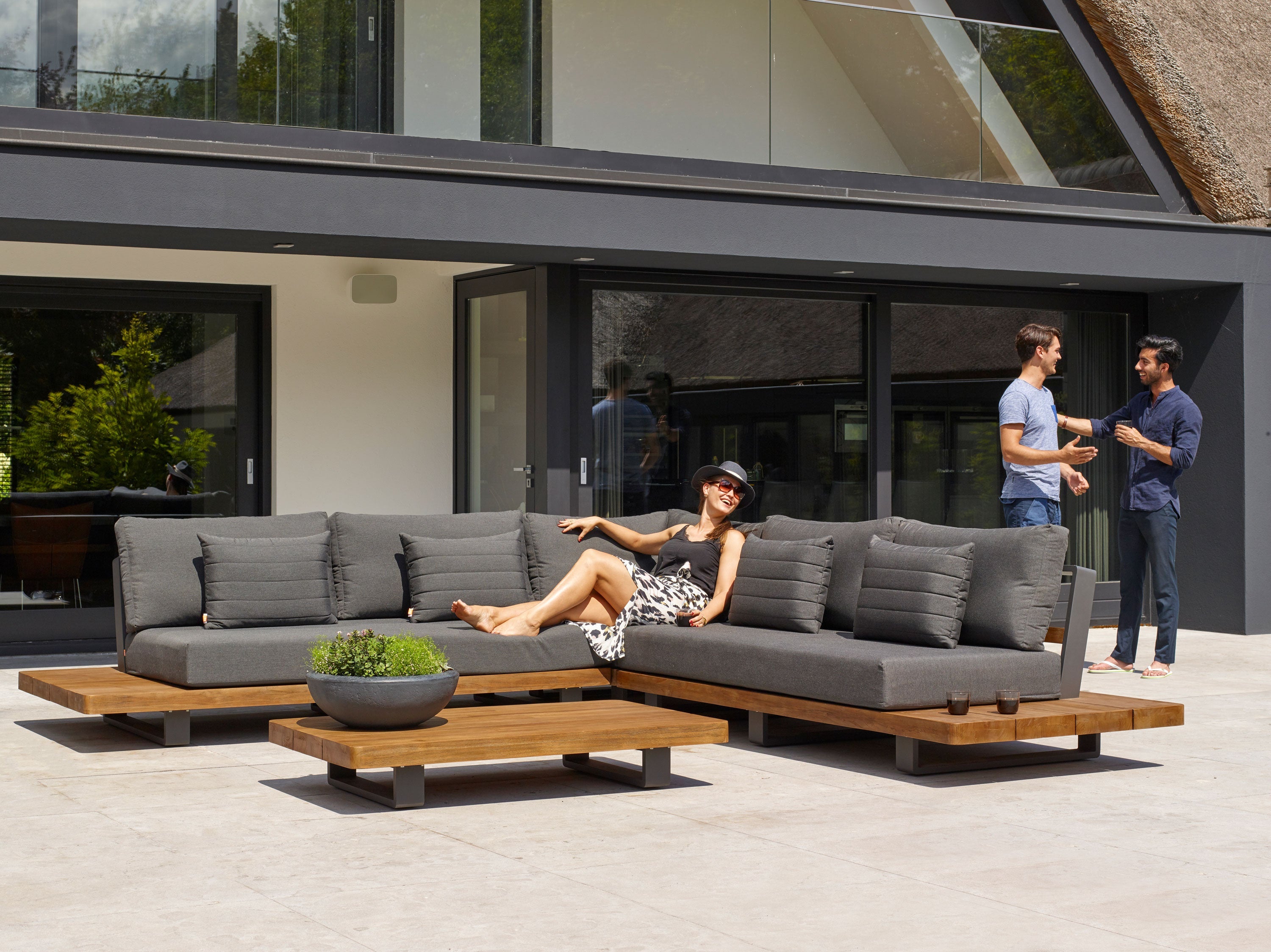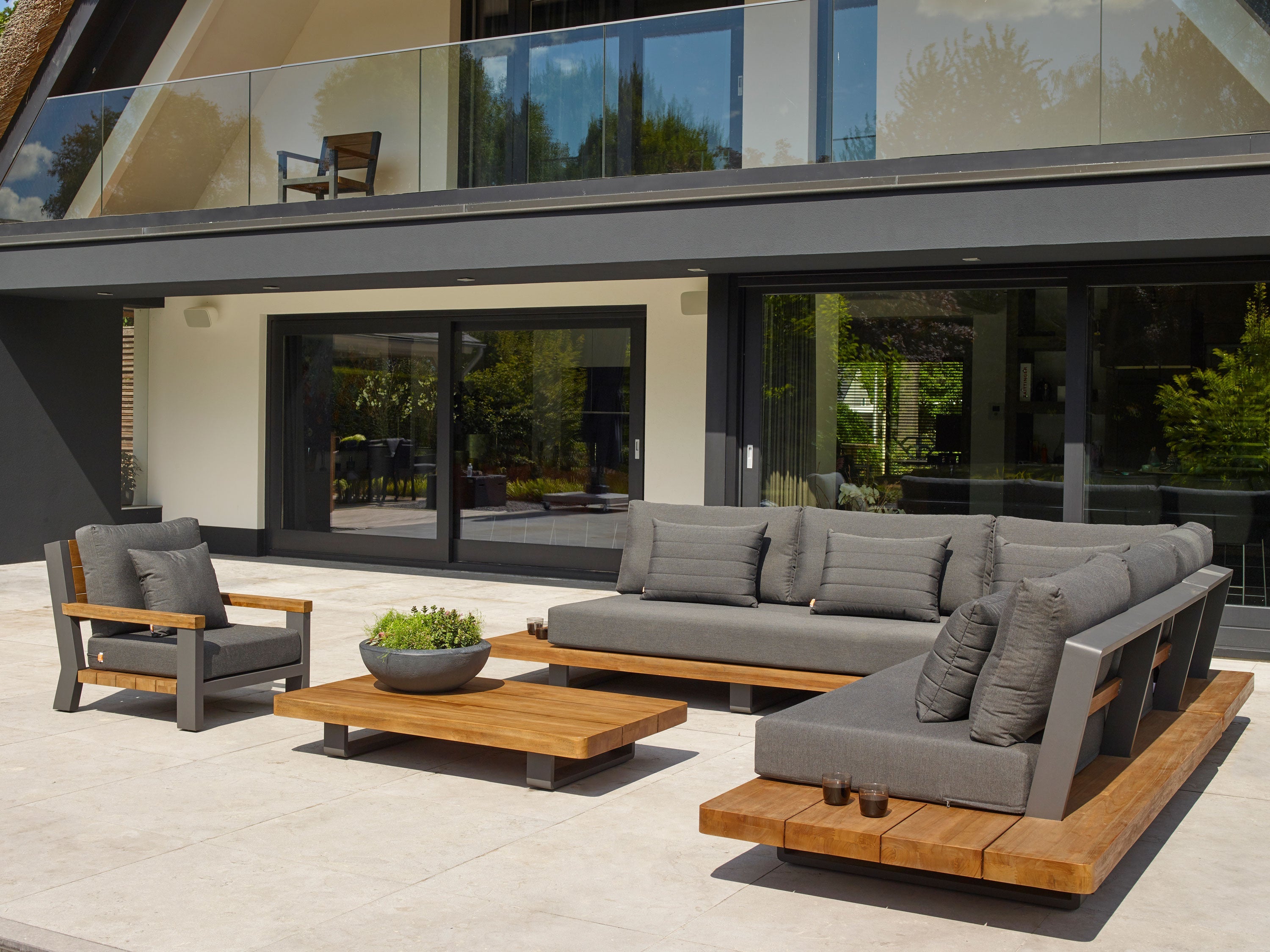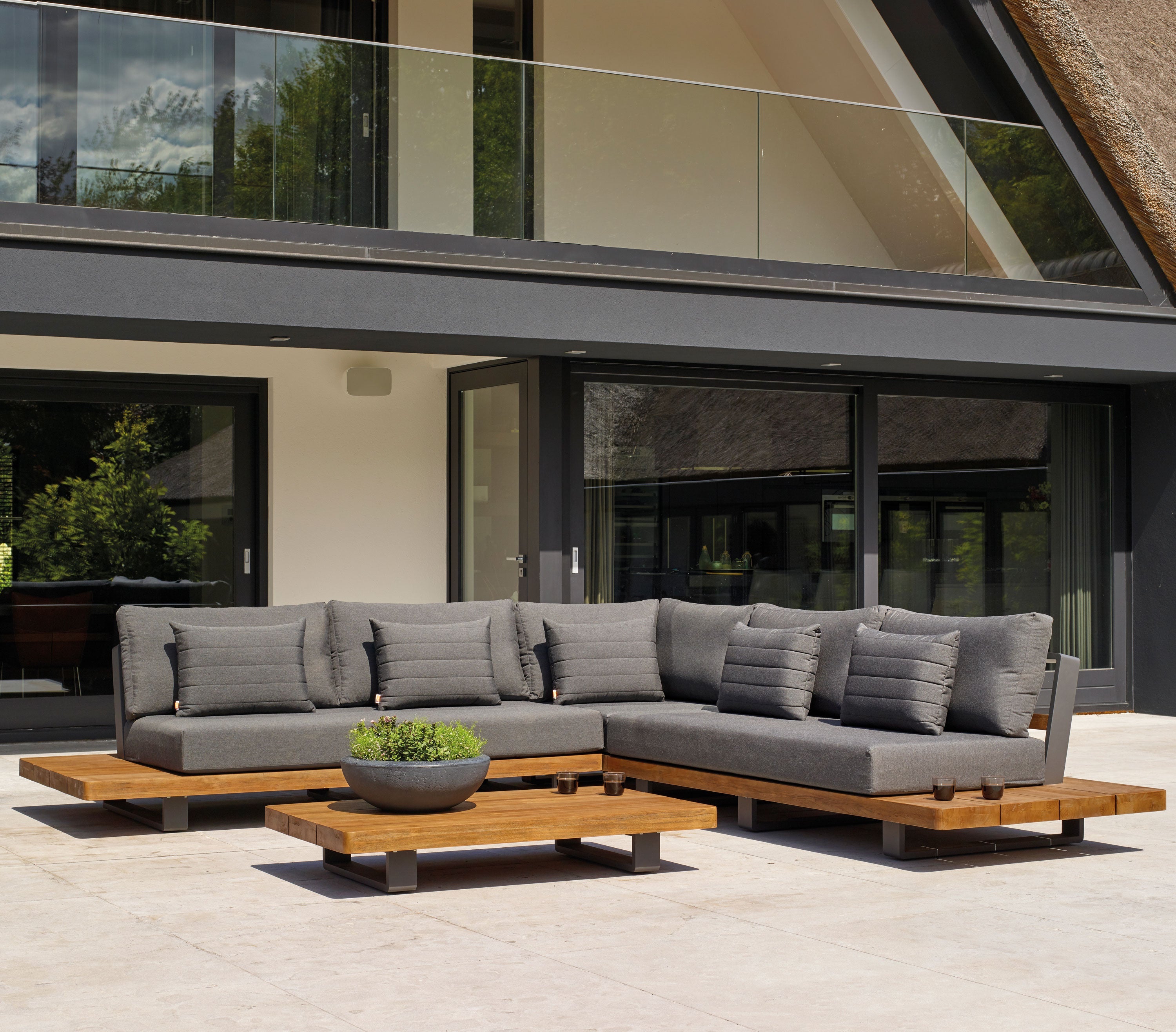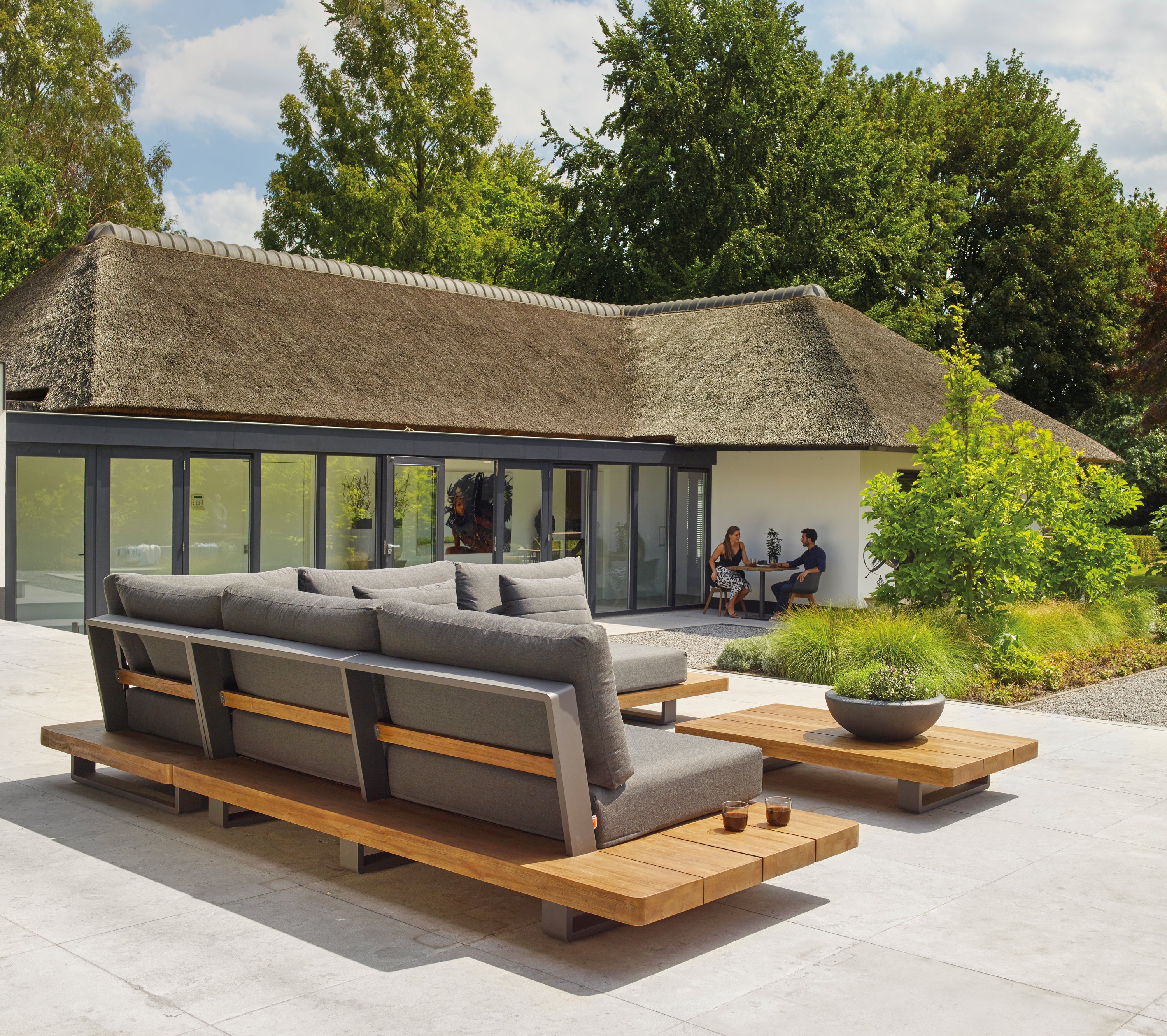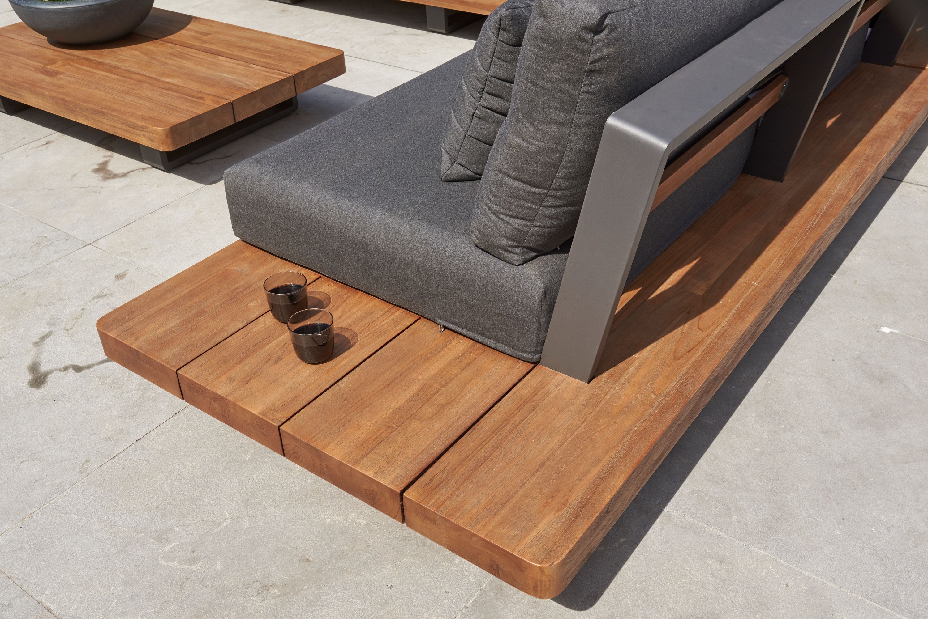Integrated teak side tables built into the sofa arms for effortless entertaining