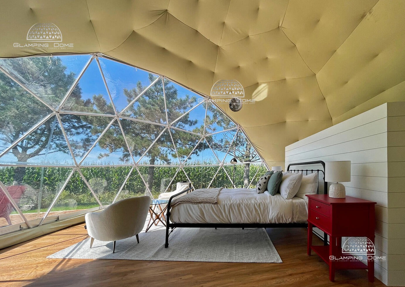 Inside, the generous floor plan easily accommodates an en-suite bedroom and a welcoming living area, making it perfect for long glamping stays or nature-inspired getaways. With clever use of vertical space, the dome can even feature a loft above an indoor bathroom — adding an extra sleeping nook that makes it comfortable for a family of four to live, rest, and reconnect.