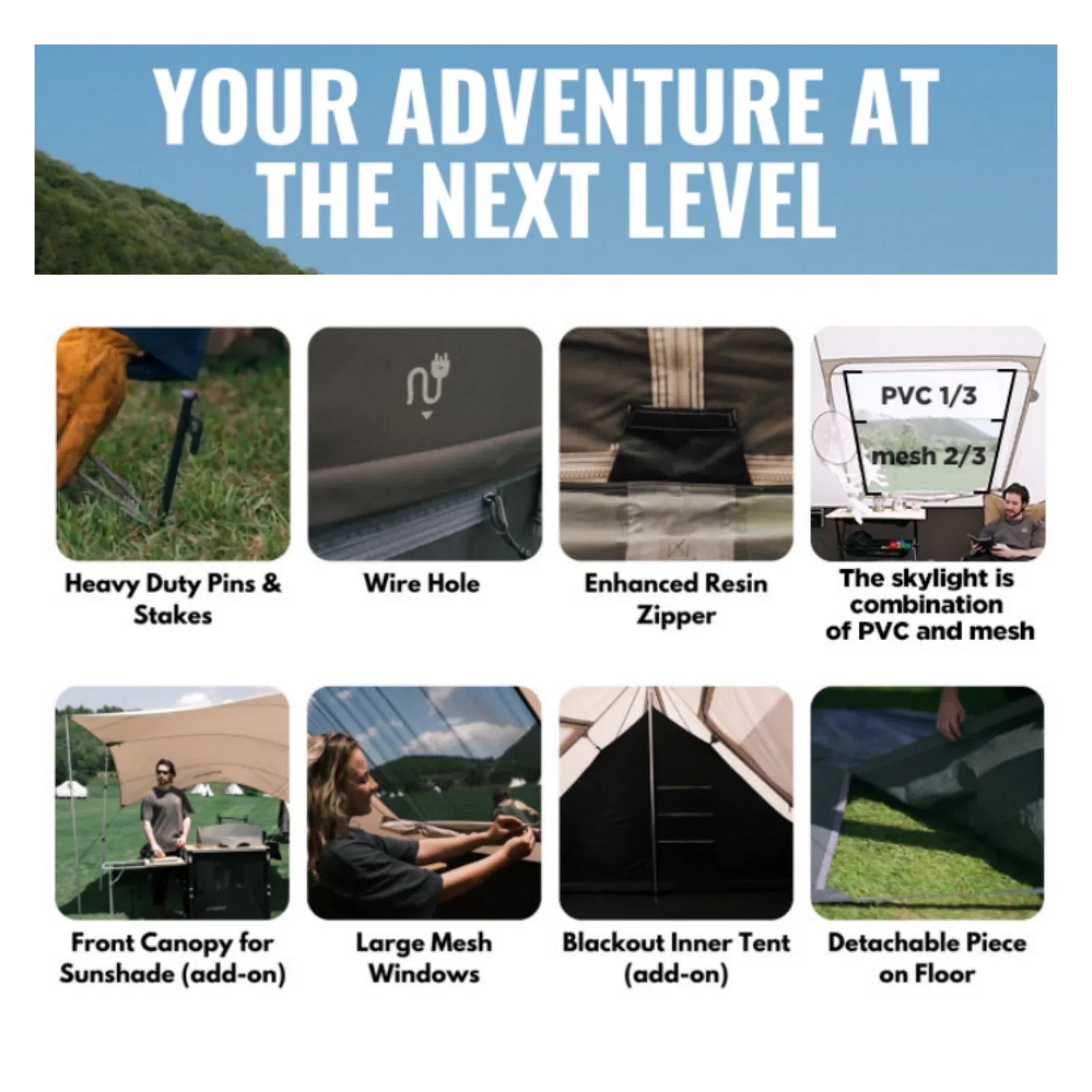 Enjoy UPF 50+ UV protection with the attachable front canopy, creating shaded outdoor living space. Mosquito nets safeguard your nights, while durable materials keep you sheltered in every season.