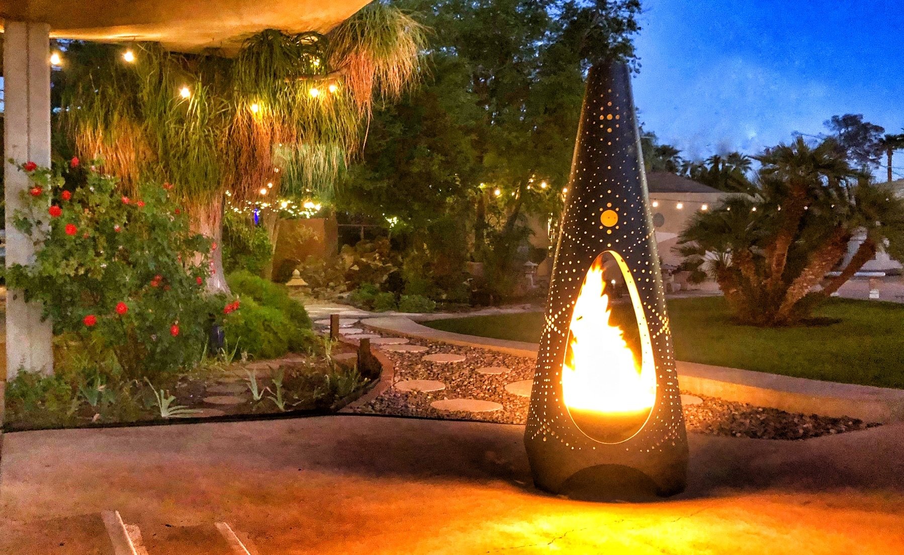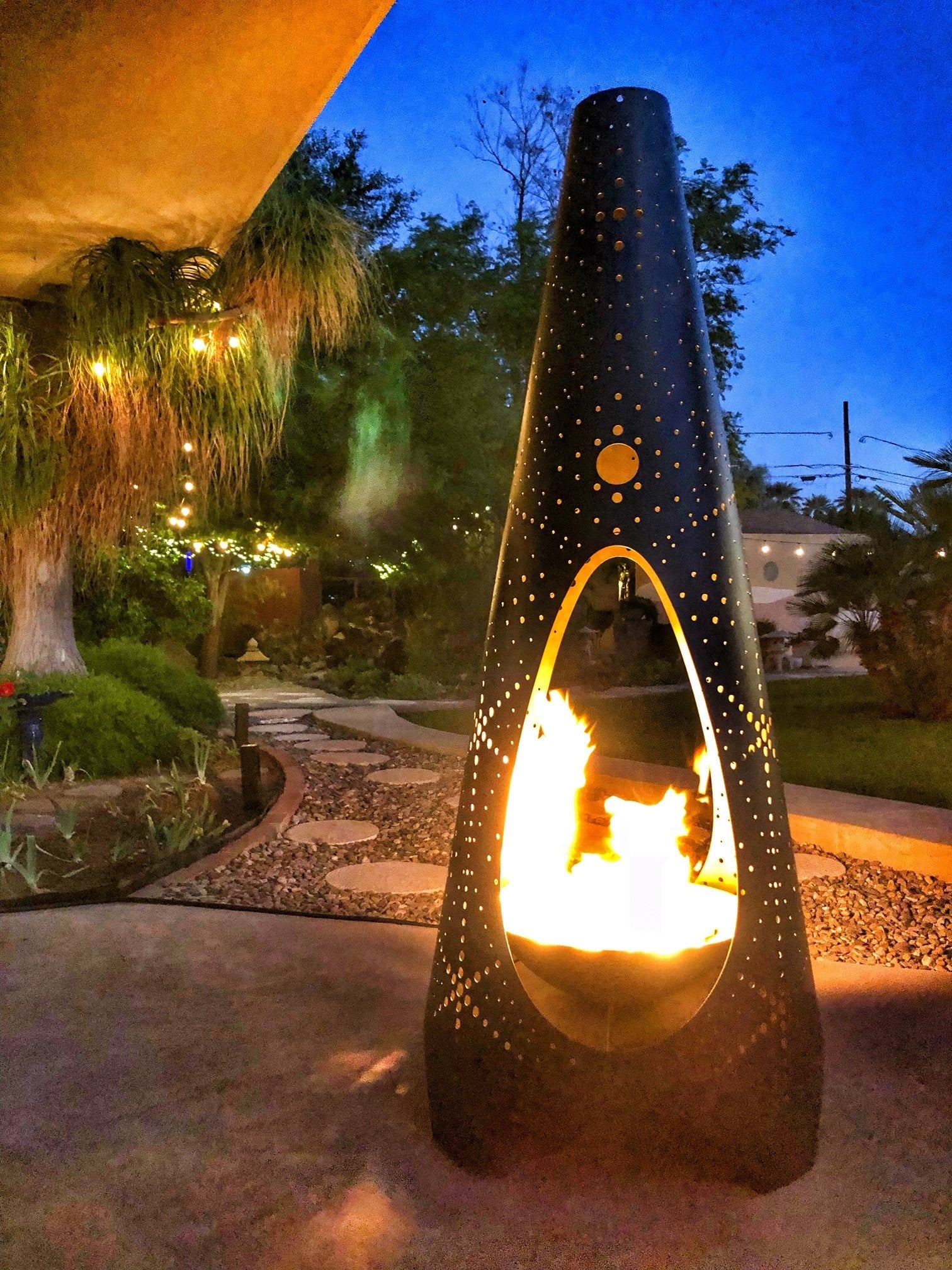 Cut with sacred geometric patterns that shimmer and dance in the firelight, this iconic piece casts more than heat — it casts magic. A true centerpiece for large outdoor spaces, it invites connection, creates ambiance, and holds space like only fire can.