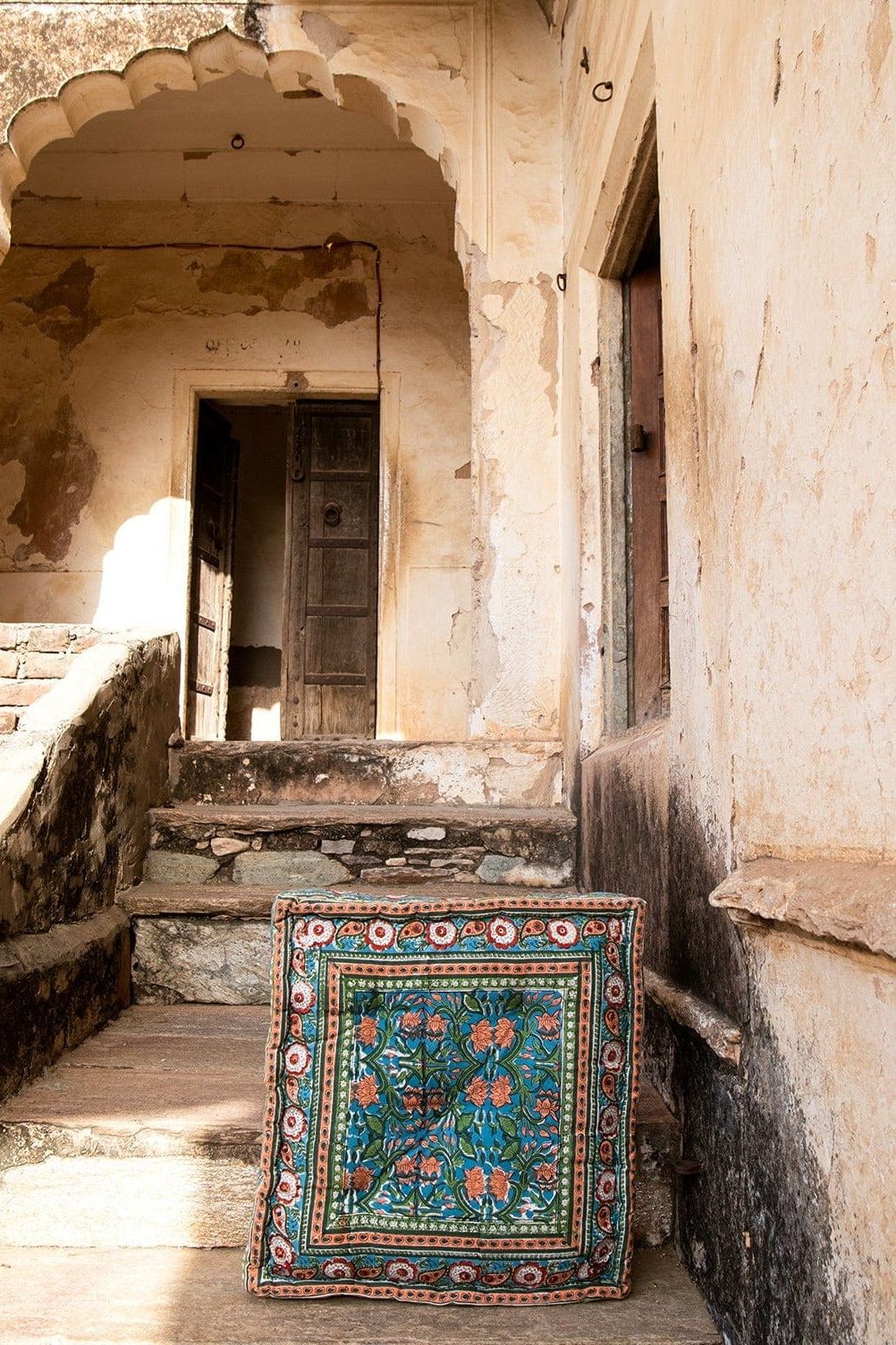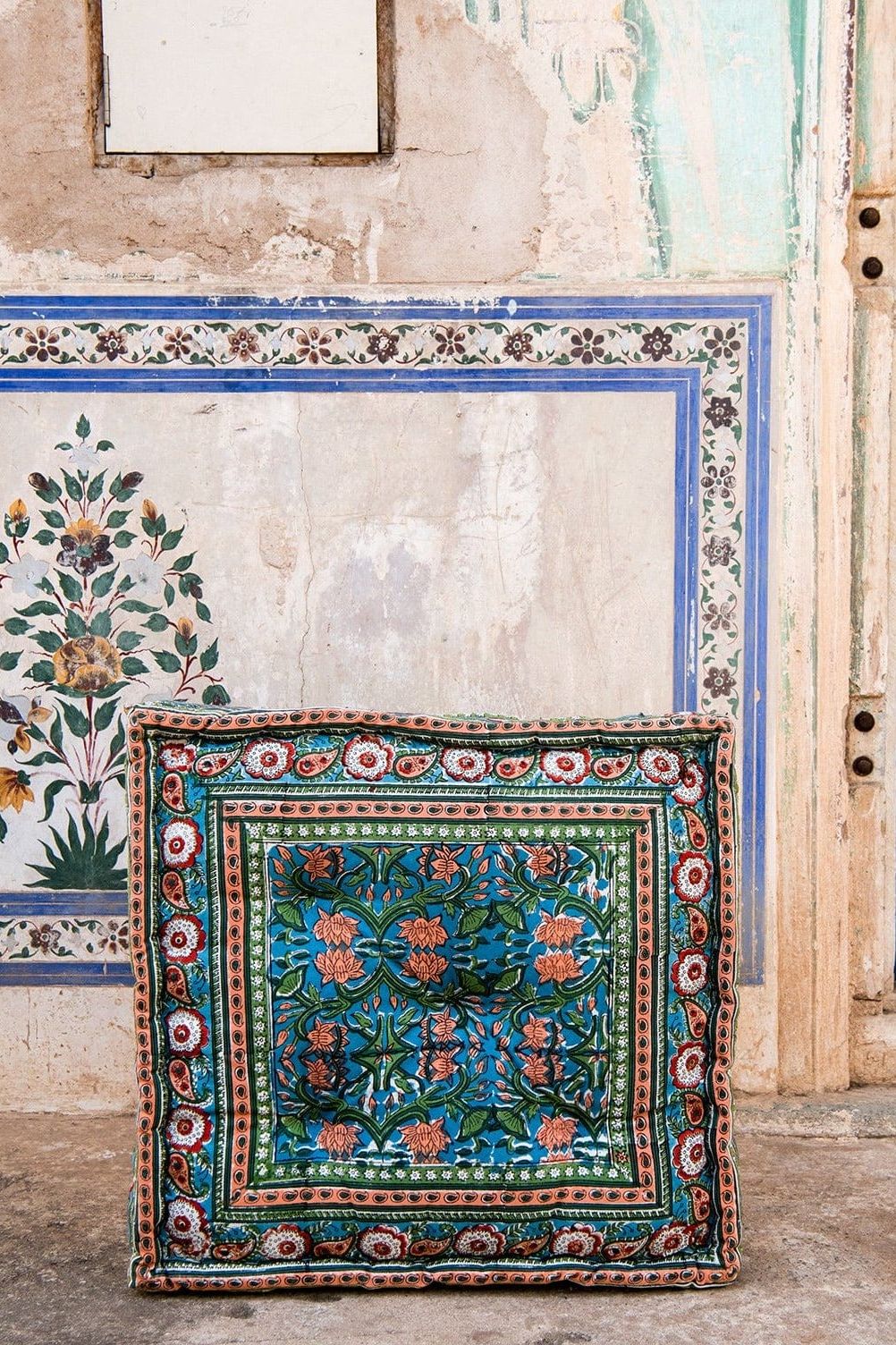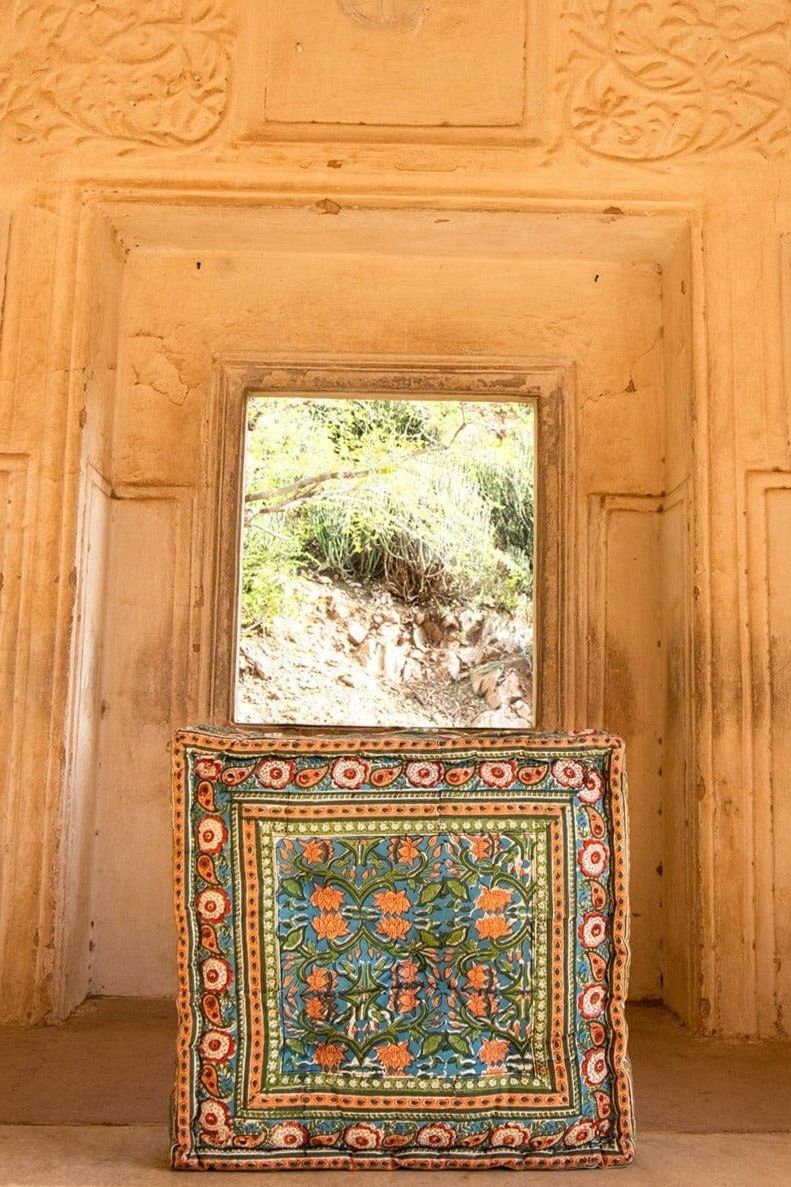 Each floor cushion is handmade, requiring attention from four types of artisans, including wood carvers, block printers, sewists, and dye... Read more