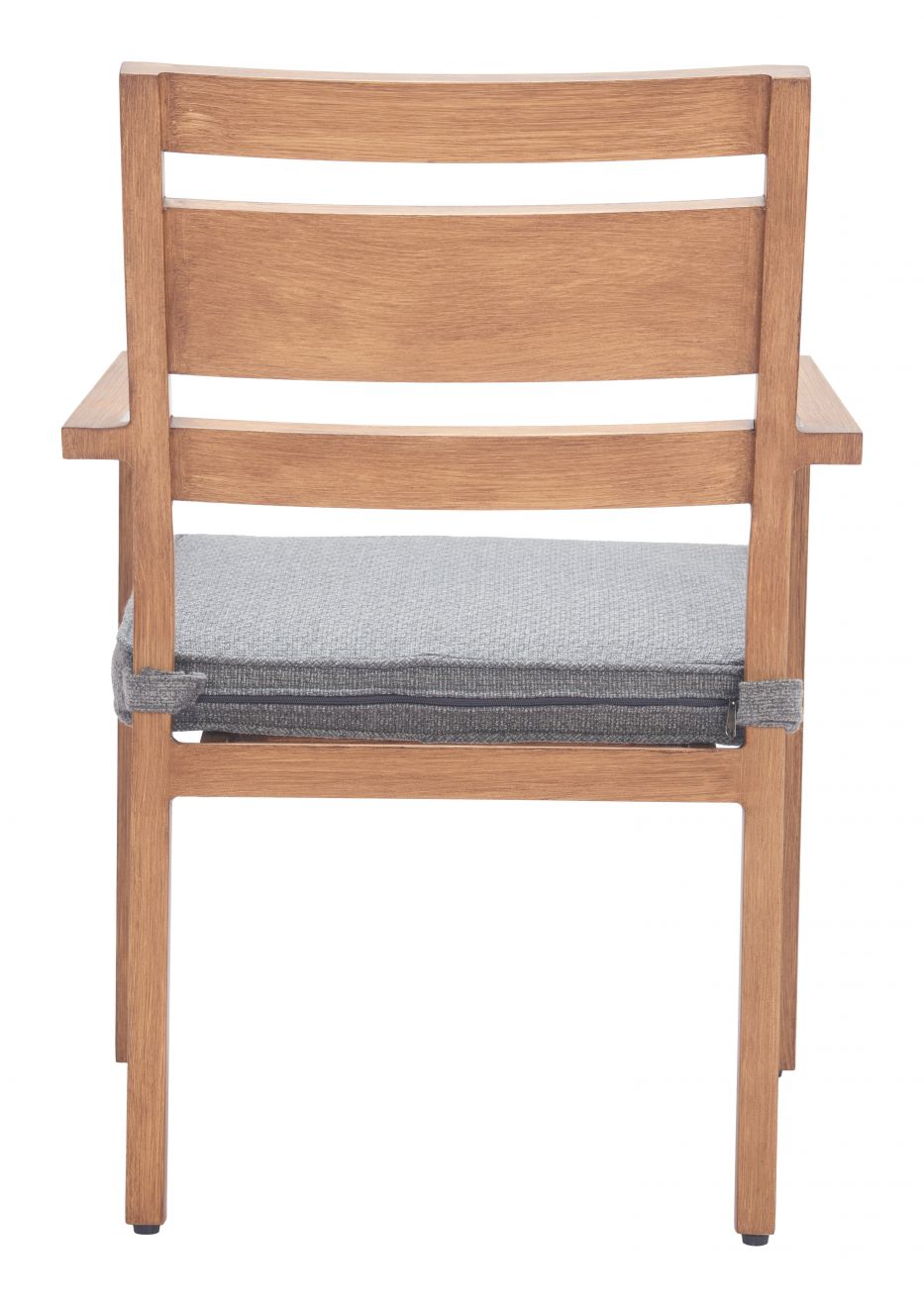Paired with it are four Rader dining chairs, featuring a sleek wood-effect aluminum frame and plush 100% olefin cushions for all-weather resilience and superior comfort. With clean lines and a modern profile, these chairs balance strength and softness, offering supportive seating that invites leisurely meals and long conversations outdoors. These chairs are stackable for convenient storage.